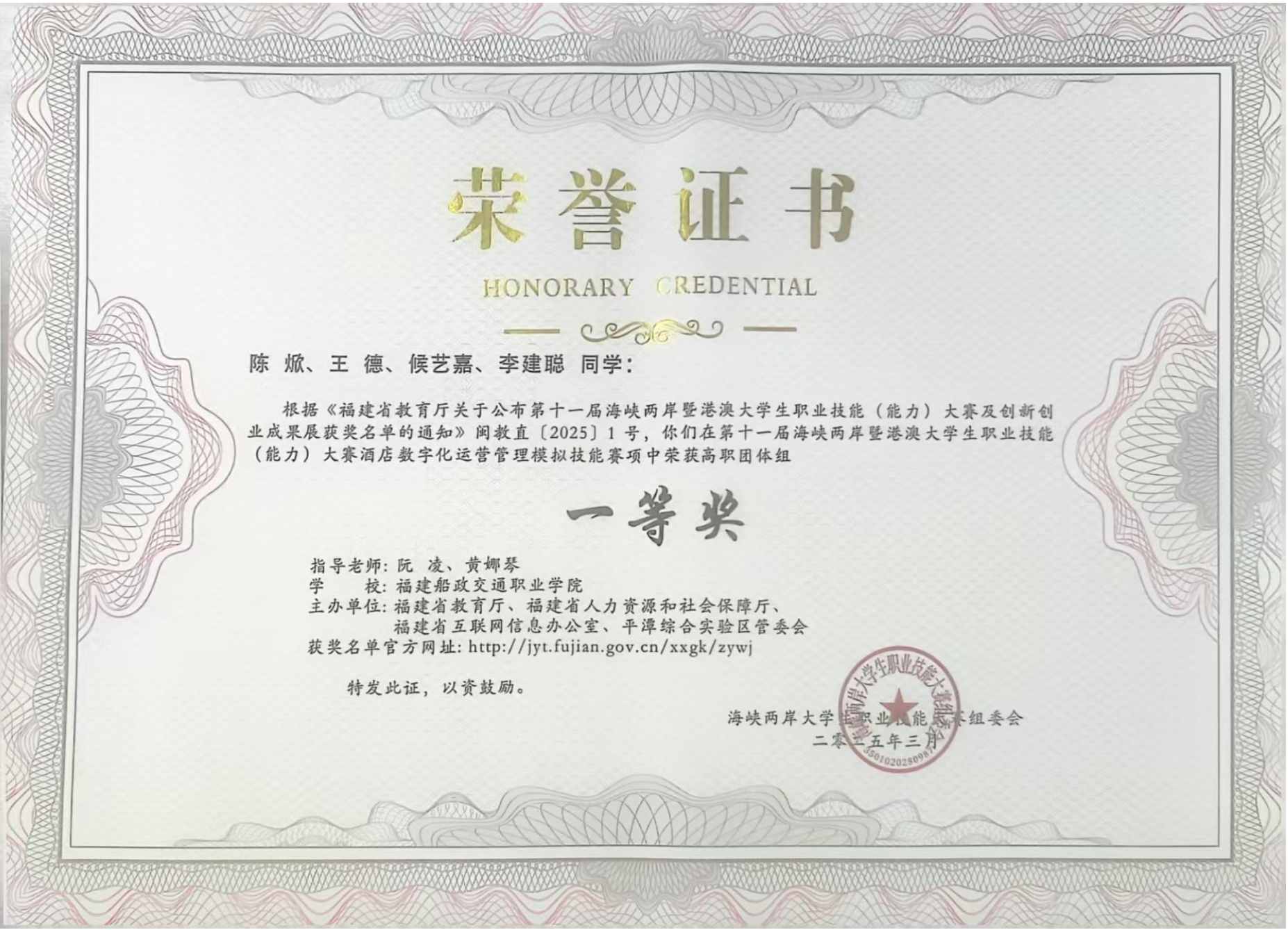 在第十一屆海峽兩岸暨港澳大學(xué)生技能大賽中,榮獲酒店數(shù)字化運營管理模擬賽項一等獎,展現(xiàn)了卓越的數(shù)字化管理能力;