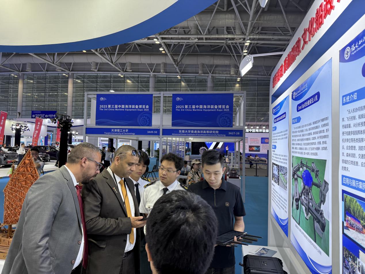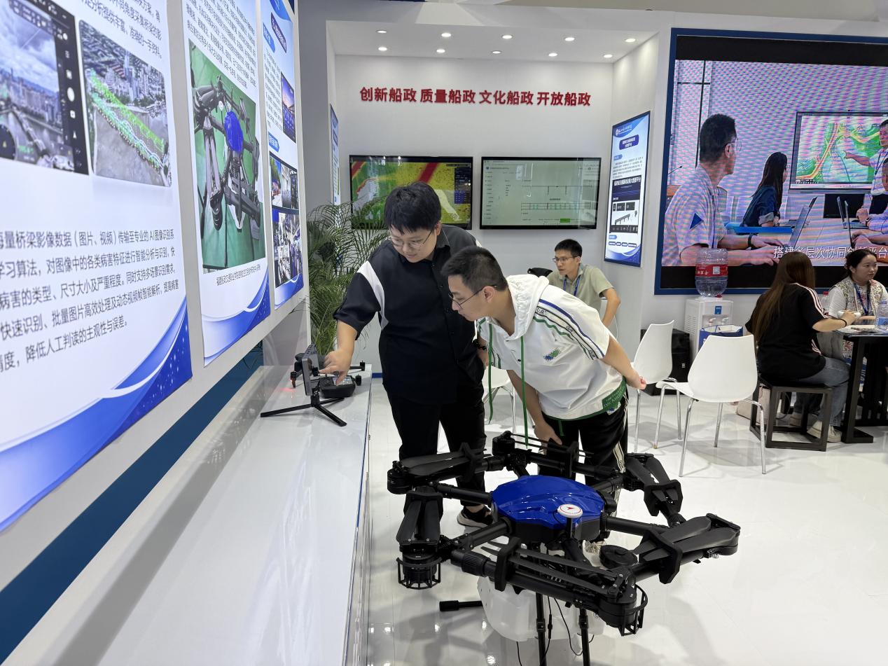 我院受邀參展并在主賓館設立展區(qū),重點展示了一系列兼具技術實力與應用價值的成果:包括傳承船政文化的趕繒船結構復原模型,聚焦智能裝備領域的 AIS 交通流分析系統(tǒng)、Ener16p 農業(yè)植保無人機、無人機協同指揮系統(tǒng)、橋梁無人機巡檢及 AI 病害識別系統(tǒng),深耕大數據應用的福建省交通基礎設施大數據平臺,以及榮獲國家級教學成果獎的《新船政學堂:燈塔型航海人才雙適任育訓范式創(chuàng)新實踐》項目。豐富多元的展品吸引了眾多參會觀眾駐足咨詢、互動體驗并拍照記錄。展區(qū)內的茶藝展示區(qū)更是成為交流熱點,專家學者們在品茗暢談間,圍繞航海類專業(yè)人才培養(yǎng)、船政文化傳承創(chuàng)新、區(qū)域海洋裝備產業(yè)升級、國際人才聯合培育等關鍵議題展開深度研討。展覽期間,我院的辦學成果與特色展品獲得多家官方媒體及自媒體的關注與宣傳報道,有效提升了學院的行業(yè)影響力與社會知名度。