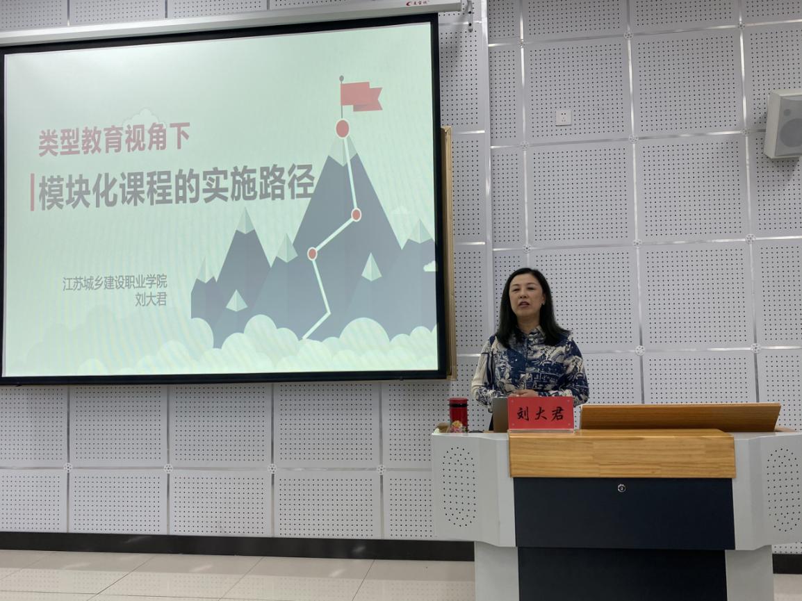 江蘇城鄉(xiāng)建設(shè)職業(yè)學(xué)院教育技術(shù)與信息中心主任、全國教師教學(xué)能力大賽評審專家劉大君以《類型教育視角下模塊化課程的路徑》為題,從課程的模塊化改革、模塊化課程的設(shè)計(jì)、項(xiàng)目式教學(xué)的實(shí)施等三部分內(nèi)容分析授課,結(jié)合教師教學(xué)能力大賽精典案例,給了我院教學(xué)創(chuàng)新團(tuán)隊(duì)教師極大的啟發(fā)。