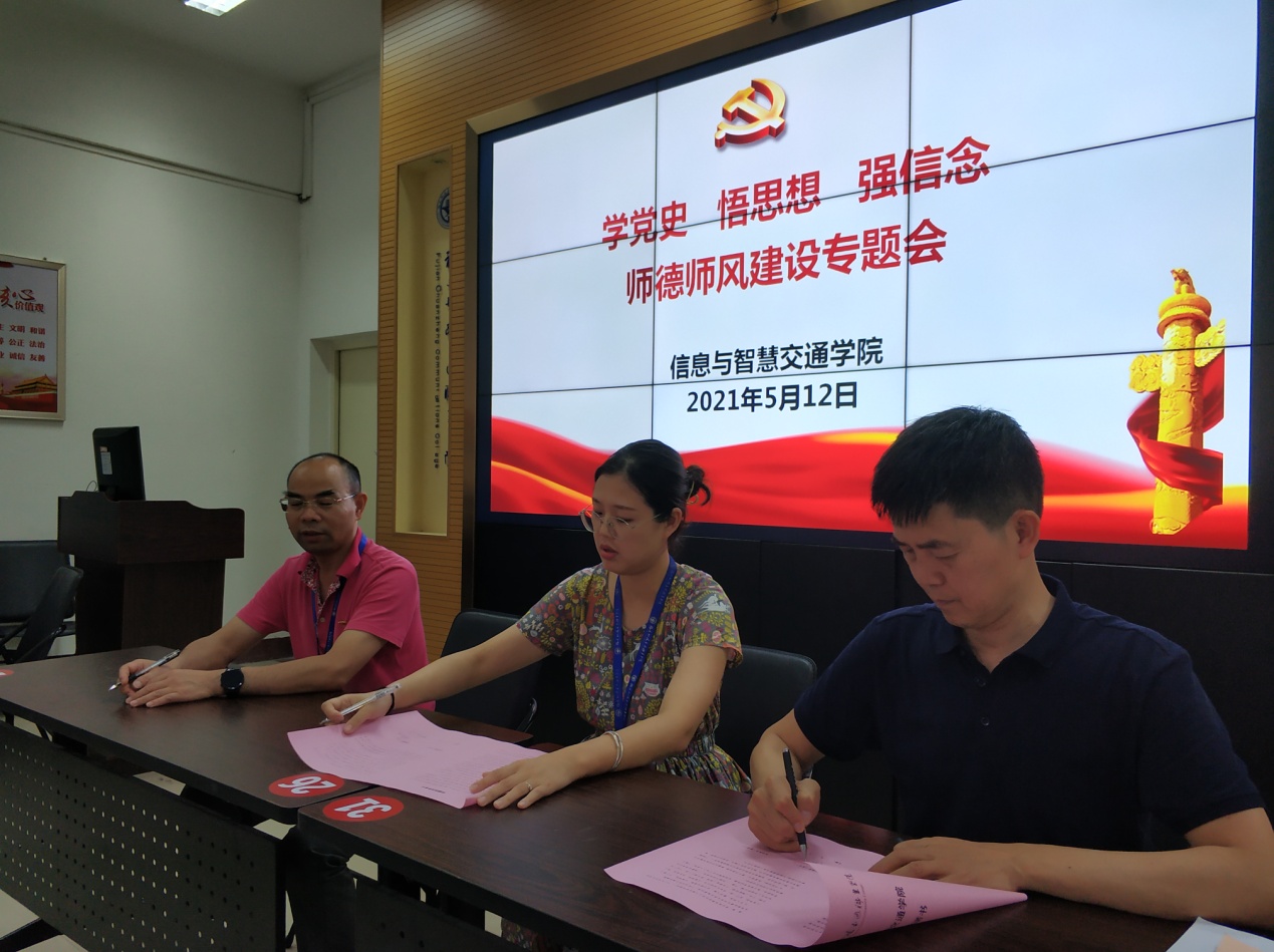 會上,學(xué)院總支書記許友孝帶領(lǐng)全體老師們認(rèn)真閱讀了《信息與智慧交通學(xué)院師德師風(fēng)承諾書》的各項(xiàng)內(nèi)容,強(qiáng)調(diào)堅(jiān)決不觸碰師德紅線,做一個(gè)遵守紀(jì)律的老師。最后每位老師鄭重地在《信息與智慧交通學(xué)院師德師風(fēng)承諾書》上簽下了自己的名字。