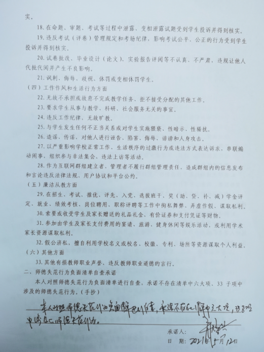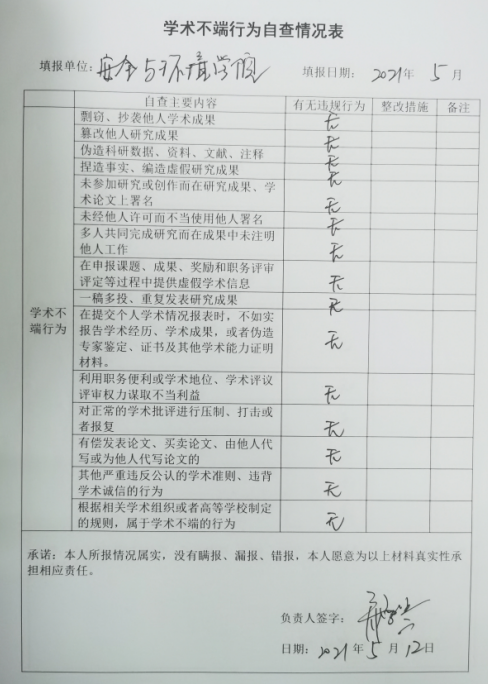 2、開展師風(fēng)師德自查。逐個(gè)教師、逐個(gè)教研室進(jìn)行徹底排查,落實(shí)每個(gè)教職工在思想政治紀(jì)律、學(xué)術(shù)道德、教育教學(xué)、工作作風(fēng)、生活行為、廉潔從教及其他等諸方面是否存在師德失范行為。全體教職工公開表態(tài)承諾,并簽訂《安全與環(huán)境學(xué)院教師師德失范行為負(fù)面清單自查承諾書》和《學(xué)術(shù)不端行為自查情況表》。