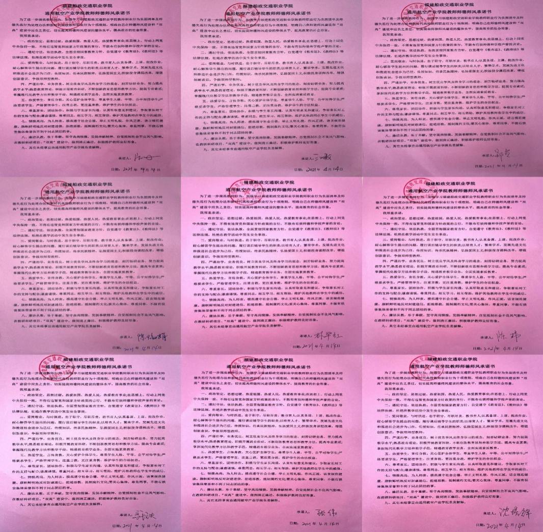 “不忘初心學(xué)黨史 ,砥礪前行鑄師魂?!睘榍袑?shí)加強(qiáng)教師職業(yè)道德和師德師風(fēng)建設(shè),進(jìn)一步規(guī)范教育教學(xué)行為,樹立廉潔從教的師德風(fēng)范。通用航空產(chǎn)業(yè)學(xué)院召開“學(xué)黨史,強(qiáng)信念,鑄師魂”師德師風(fēng)專題培訓(xùn),全體教師參加了培訓(xùn)會(huì),會(huì)議由黨總支副書記蘇漢美主持。首先,由副書記蘇漢美帶領(lǐng)老師重點(diǎn)學(xué)習(xí)4月12日至13日在京召開的全國職業(yè)教育大會(huì)《習(xí)近平總書記對職業(yè)教育工作重要指示和全國職業(yè)教育大會(huì)精神》、學(xué)習(xí)了《新時(shí)代高校教師職業(yè)行為十項(xiàng)準(zhǔn)則》、《福建船政交通職業(yè)學(xué)院教師職業(yè)行為負(fù)面清單及師德失范行為處理辦法》相關(guān)規(guī)范和條文,號召全體教師要不斷提高師德素養(yǎng),嚴(yán)于律己,履行教師職責(zé),使大家明確了本次專題活動(dòng)的重要性及意義與會(huì)老師在相互見證下鄭重地簽下了承諾書。