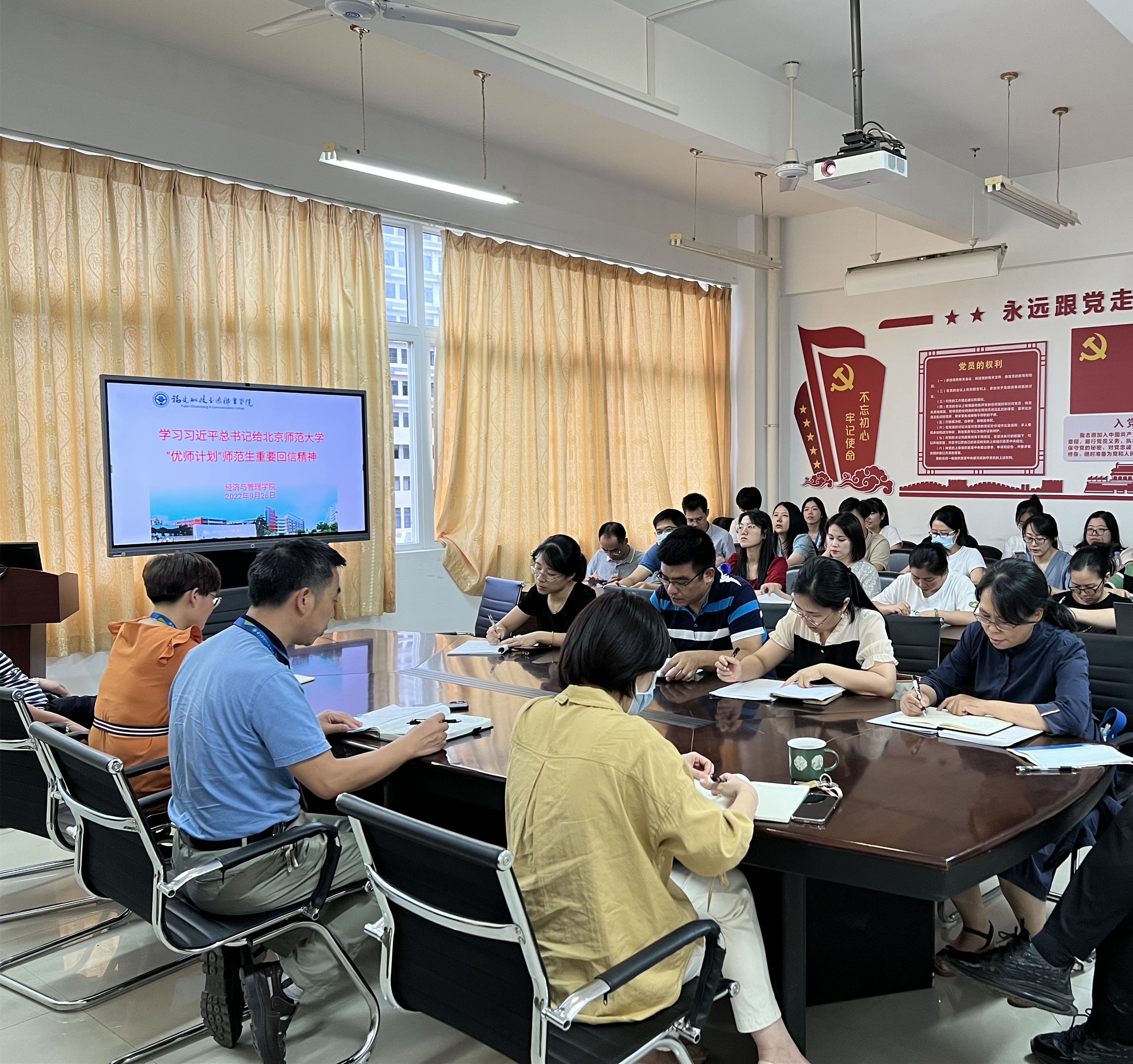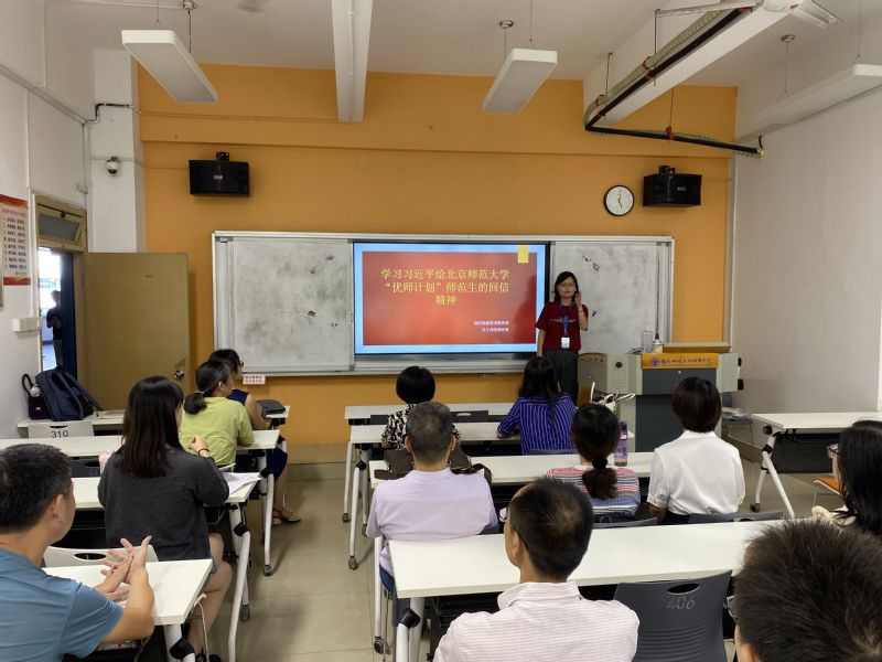 學習會上,俞素平書記帶領全體與會教師學習了習近平總書記給北京師范大學“優(yōu)師計劃”師范生重要回信內(nèi)容,并觀看了專題片《習近平的教師情》。