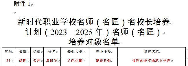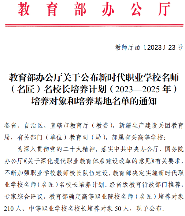 近日,教育部辦公廳下發(fā)《關(guān)于公布新時代職業(yè)學(xué)校名師(名匠)名校長培養(yǎng)計劃(2023—2025年)培養(yǎng)對象和培養(yǎng)基地名單的通知》,確定高等職業(yè)院校名師(名匠)培養(yǎng)對象210人、中等職業(yè)學(xué)校名校長培養(yǎng)對象50人。我院房曰榮教授入選為高等職業(yè)院校名師培養(yǎng)對象。