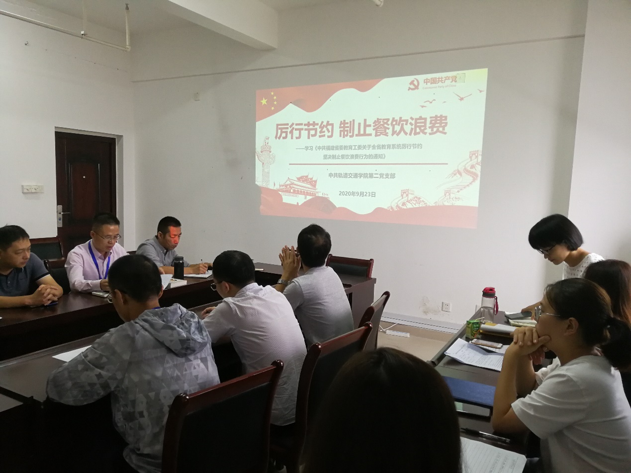 9月23日下午13:30,軌道交通學(xué)院第二黨支部全體黨員在圖書館11樓會議室開展了以“厲行勤儉節(jié)約、反對餐飲浪費(fèi)”為主題的黨日活動(dòng),支部書記陳天炎同志主持了本次黨日活動(dòng)。