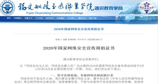根據(jù)學校宣傳統(tǒng)戰(zhàn)部《關(guān)于開展國家網(wǎng)絡(luò)安全宣傳周活動的通知》要求,我院圍繞“網(wǎng)絡(luò)安全為人民,網(wǎng)絡(luò)安全靠人民”開展了2020年國家網(wǎng)絡(luò)安全宣傳周活動。