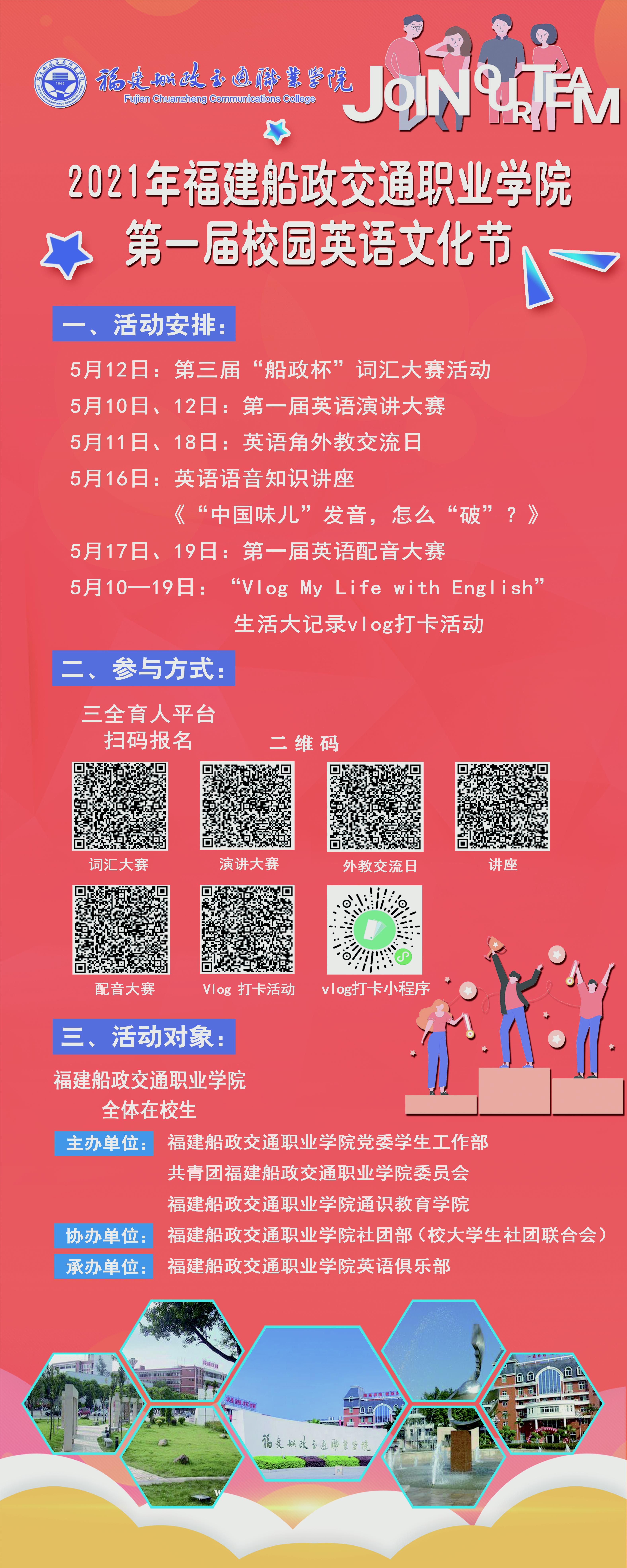 在慶祝中國(guó)共產(chǎn)黨建黨100周年之際,為貫徹落實(shí)《國(guó)家職業(yè)教育改革實(shí)施方案》等文件精神,扎實(shí)推進(jìn)黨史學(xué)習(xí)教育,弘揚(yáng)中華優(yōu)秀傳統(tǒng)文化,推進(jìn)《高職英語(yǔ)》作為人文素養(yǎng)教育重要基地的建設(shè),將人文素質(zhì)教育有效地融人到英語(yǔ)教學(xué)和第二課堂中,堅(jiān)定文化自信,更好地落實(shí)“立德樹(shù)人、文化育人”的目標(biāo),拓展學(xué)生的全球化視野,培養(yǎng)跨文化交際能力,院黨委學(xué)生工作部、院團(tuán)委和通識(shí)教育學(xué)院聯(lián)合舉辦2021年福建船政交通職業(yè)學(xué)院第一屆英語(yǔ)文化節(jié)。