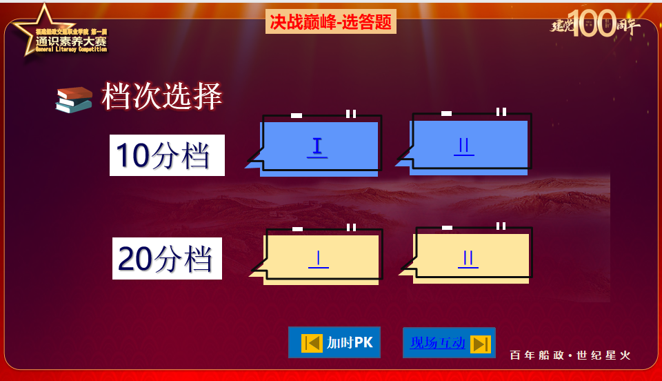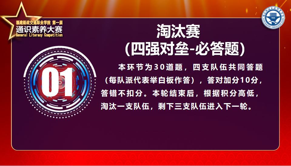 本輪共60題搶答題,使用搶答器搶答、口頭答題。每答對1題加分10分,答錯不扣分。本輪結(jié)束后,根據(jù)積分淘汰一支隊伍,剩下兩支隊伍晉級,本輪分?jǐn)?shù)全部清零,每支隊伍各有100分基礎(chǔ)分進(jìn)入下一輪比拼。