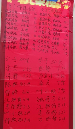 本次挑戰(zhàn)賽測試4個基礎(chǔ)體 能項目,男子組:引體向上、50米、立定跳遠、1000米。女子組:仰臥起坐、50米、立定跳遠、800米。各個學(xué)院積極響應(yīng),八個學(xué)院共派出95名精英參加本次比賽,本次比賽有三個環(huán)節(jié),第一環(huán)節(jié)是5月27日晚上測試的立定跳遠、女子仰臥起坐、男子引體向上。第二個環(huán)節(jié)是6月3日測試50米男子1000米、女子800米,第三個環(huán)節(jié)是6月9日的頒獎儀式。