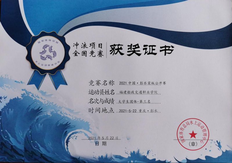 近期,由國家體育總局水上運(yùn)動管理中心主辦的“第十屆中國?彭水槳板公開賽”在重慶舉行。學(xué)院選派8名學(xué)生組成代表隊(duì)首次參賽,全體隊(duì)員發(fā)揮不懼壓力、勇于拼搏的精神,共獲得大學(xué)生組5個單項(xiàng)獎,團(tuán)體總分第三名的優(yōu)異成績。