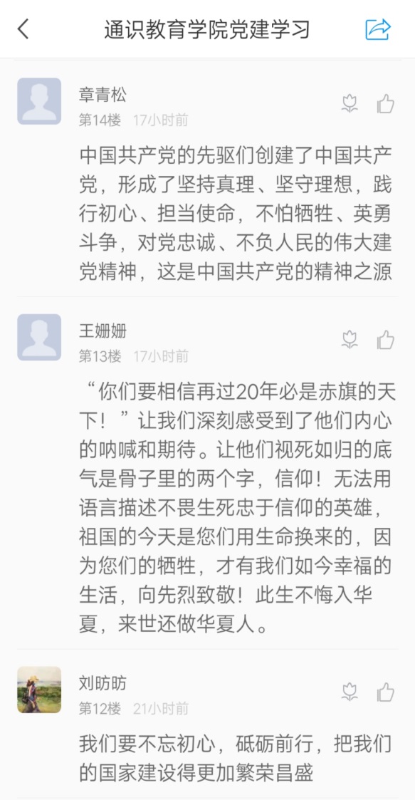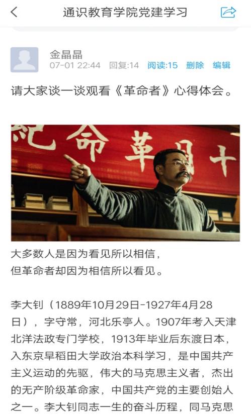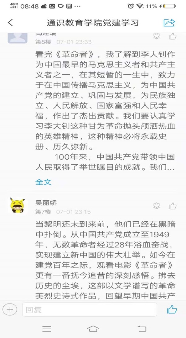 歷史川流不息,精神代代相傳。在觀影結(jié)束后各黨員通過“學(xué)習(xí)通”-“通識教育學(xué)院黨總支”-“討論”-“觀看黨建電影《革命者》,撰寫心得體會”,通過觀看紅色電影《革命者》,師生黨員深刻感受到中國共產(chǎn)黨先驅(qū)們偉大的建黨精神,在奮斗中堅持真理、堅守理想,踐行初心、擔(dān)當(dāng)使命,不怕犧牲、英勇斗爭,對黨忠誠、不負人民,大家紛紛表示要繼續(xù)弘揚光榮傳統(tǒng)、賡續(xù)紅色血脈,永遠把偉大建黨精神繼承下去、發(fā)揚光大。