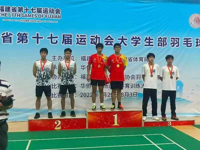 2022年7月27日-8月3日,福建省第十七屆運動會(大學生部)羽毛球比賽在華僑大學泉州校區(qū)開賽,來自全省43所高校的353名運動員參賽。本次比賽包括男子單打、男子雙打、女子單打、女子雙打、男子團體、女子團體6個項目,我院羽毛球代表隊榮獲福建省第十七屆運動會(大學生部)羽毛球比賽丙組團體總積分第一名的優(yōu)異成績,并獲得“體育道德風尚獎運動隊”榮譽稱號,運動員蔣賢智、楊舒淇獲個人“體育道德風尚獎”,王姍姍老師獲“優(yōu)秀教練員”榮譽稱號。