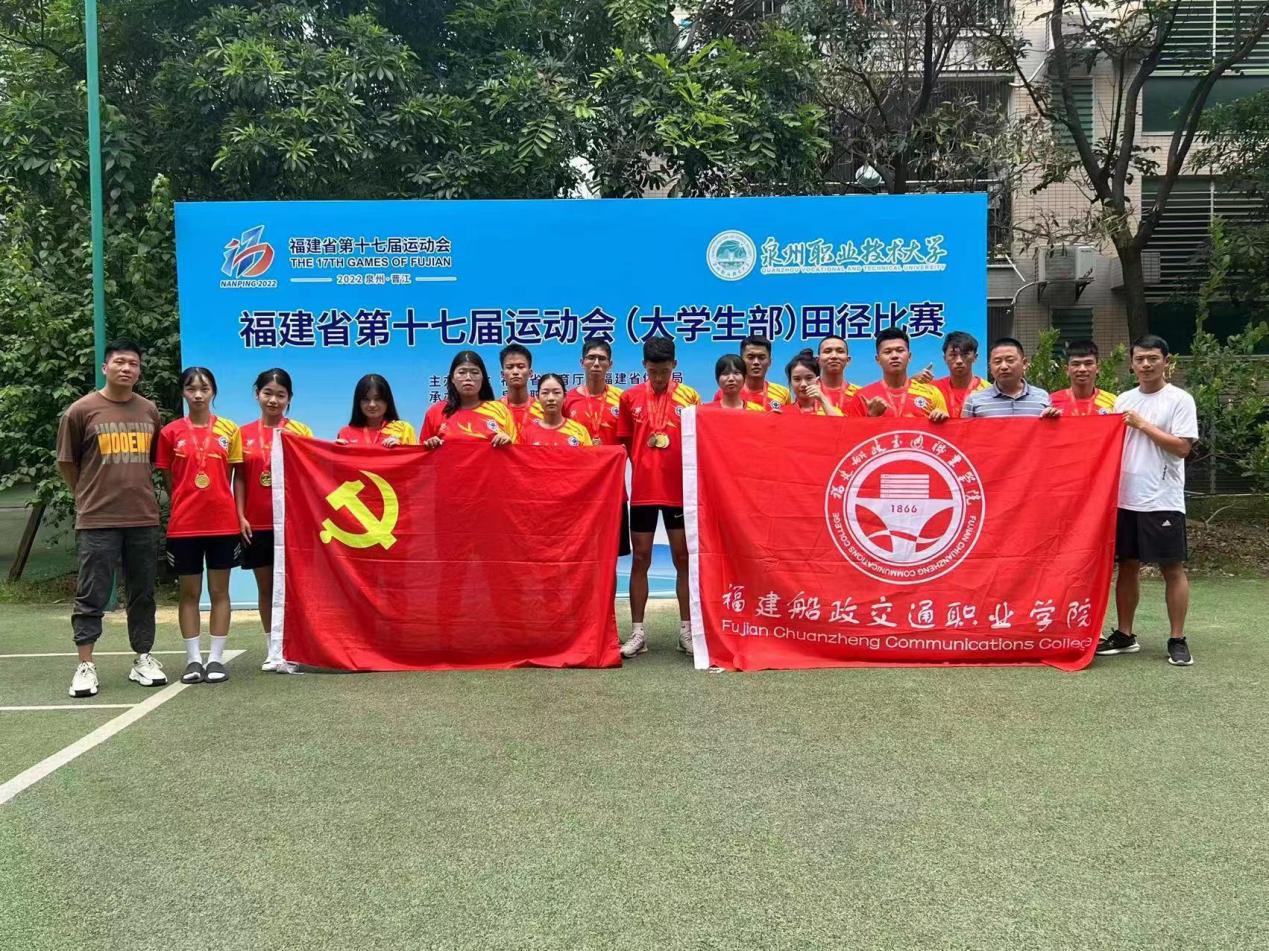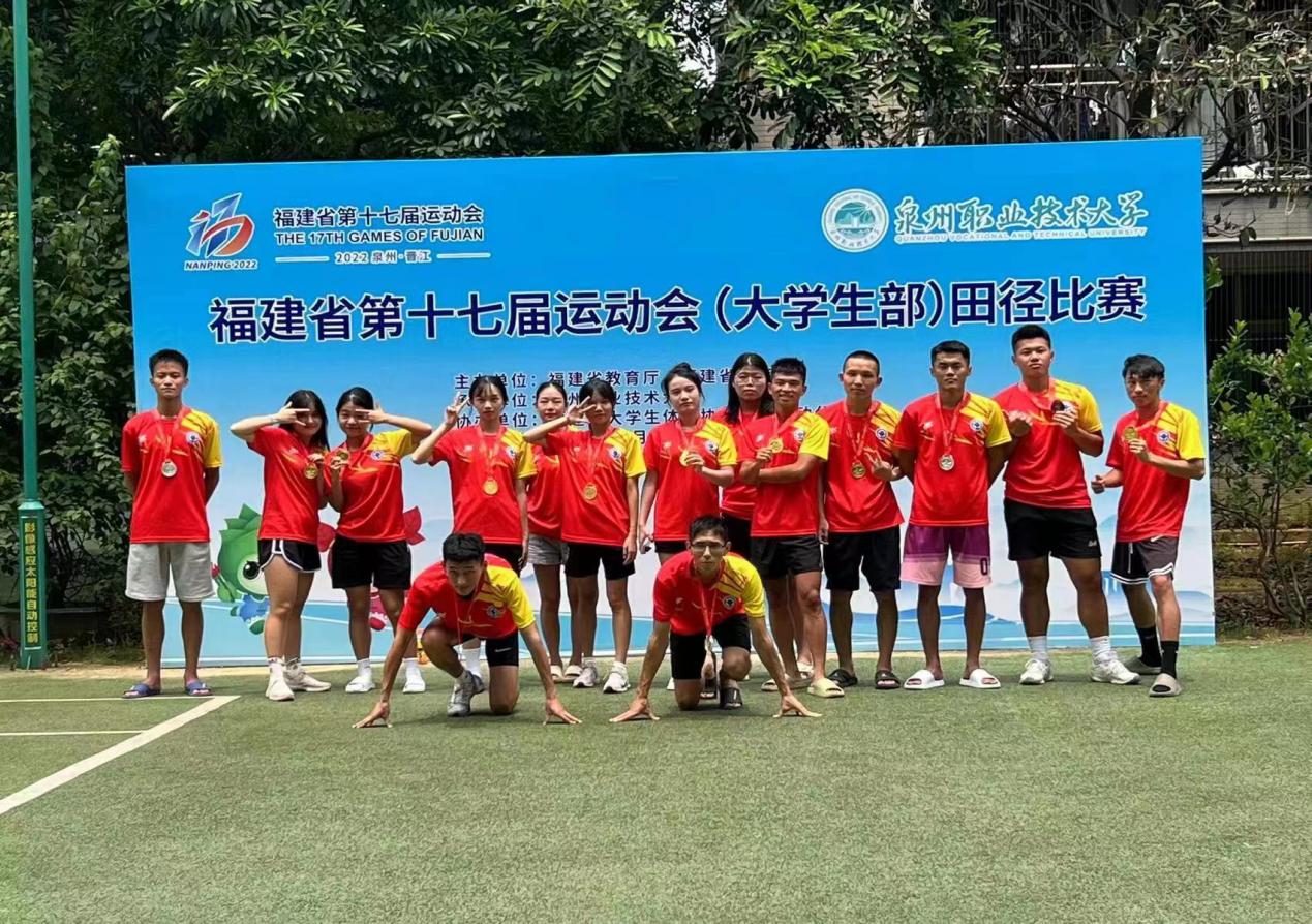 2022年7月31日——8月7日,福建省第十七屆運(yùn)動(dòng)會(huì)(大學(xué)生部)田徑比賽在泉州職業(yè)技術(shù)大學(xué)順利舉辦。此次比賽由福建省教育廳、福建省體育局主辦,共吸引來自省內(nèi)80多所高校的1500多位運(yùn)動(dòng)健兒參賽。經(jīng)過激烈角逐,我院田徑隊(duì)分別在丙組男子100米、200米、跳高、跳遠(yuǎn)、800米、鐵餅、1500米和5000米,女子100米、鉛球、鐵餅等項(xiàng)目斬金奪銀,以10金3銀3銅,改寫5項(xiàng)賽會(huì)記錄,以222分的優(yōu)異成績榮獲丙組團(tuán)體總分第一。