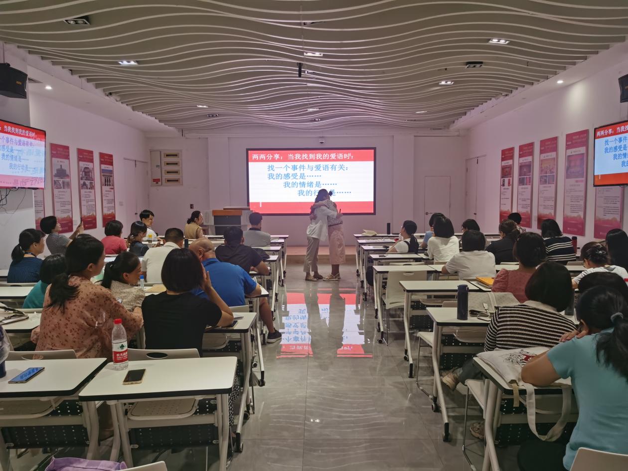 課上,李榕輝老師從教師心理健康出發(fā),結(jié)合生動的案例和自身經(jīng)歷,介紹家庭親子溝通的重要性、意義和途徑,重點(diǎn)闡述了肯定的言詞、精心的時(shí)刻、接受禮物、服務(wù)的行動和身體的接觸等“愛的五種語言”,以及具體表達(dá)方式。現(xiàn)場氣氛活躍,李榕輝開展多次互動游戲、測試、冥想母愛之光等活動,有效教師們打開良好溝通之門,提高與家人溝通的質(zhì)量。老師們紛紛表示,培訓(xùn)課氛圍感好,實(shí)用性強(qiáng),工作離不開家庭,離不開良好的親子關(guān)系,從培訓(xùn)課中學(xué)會了實(shí)用親子表達(dá)溝通的方式和技巧。