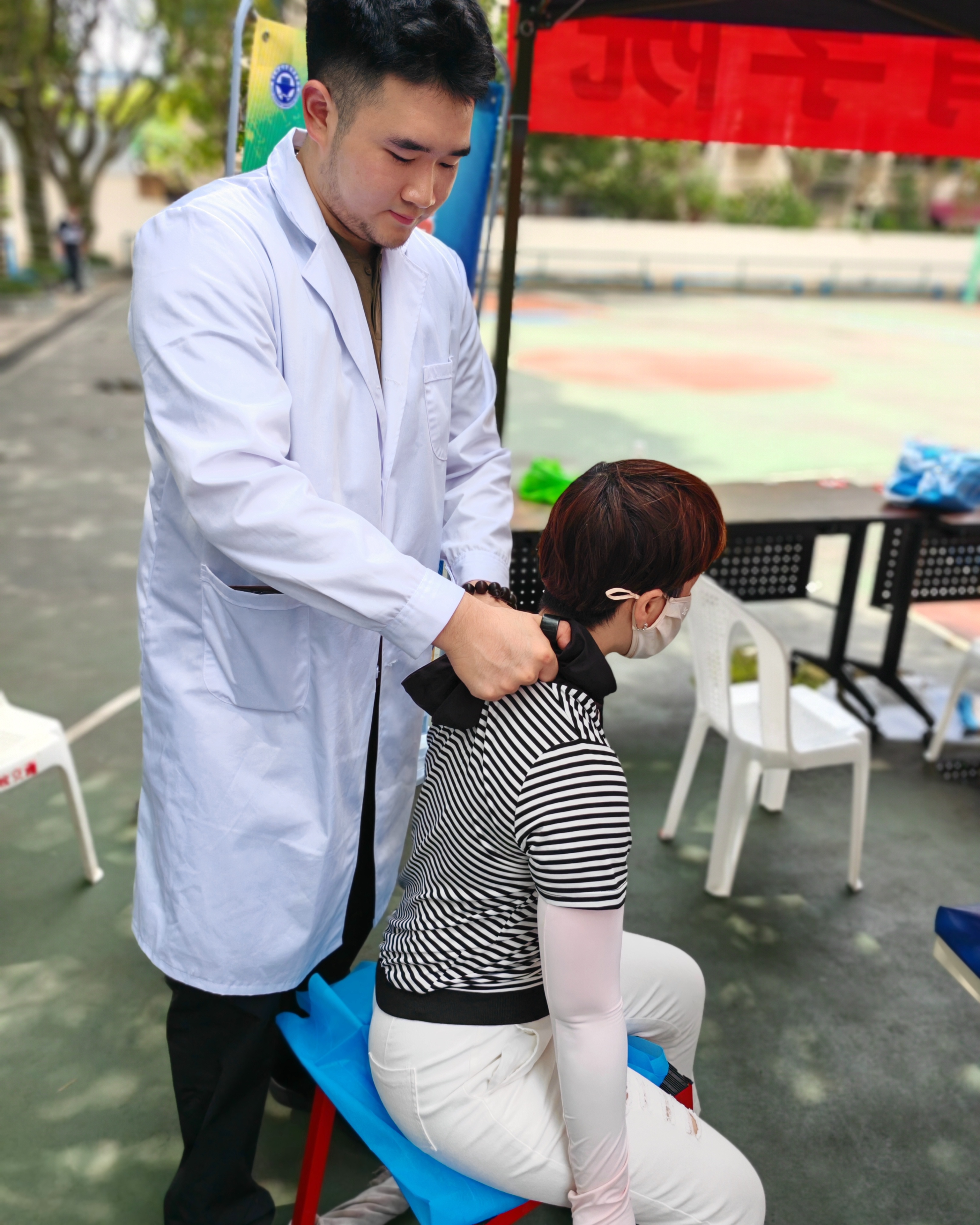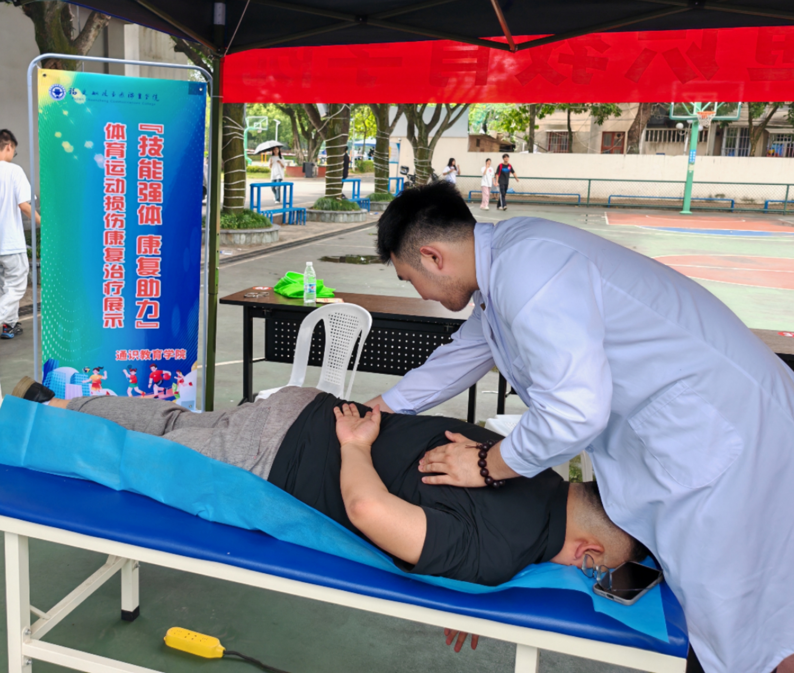 活動現(xiàn)場,學生團隊在教師指導下,為參觀者展示推拿、穴位按摩等中醫(yī)傳統(tǒng)康復技法,并重點針對運動中常見的腰椎間勞損問題,現(xiàn)場演示“評估-手法-養(yǎng)護”全流程解決方案。學生們結(jié)合人體經(jīng)絡模型,細致講解腰部穴位定位及保健手法,同時向長期久坐、運動愛好者等群體提出“科學熱身+核心肌群訓練+日常姿勢管理”等針對性建議,受到廣泛好評。