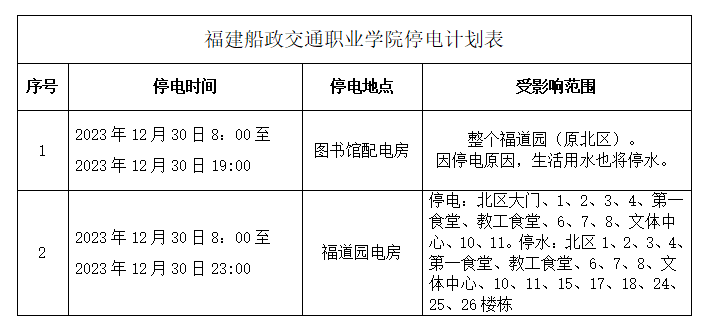 因電力公司先農(nóng)變627首山東線檢修,屆時將影響我校(福道園)用電,具體停電時間安排如下表: