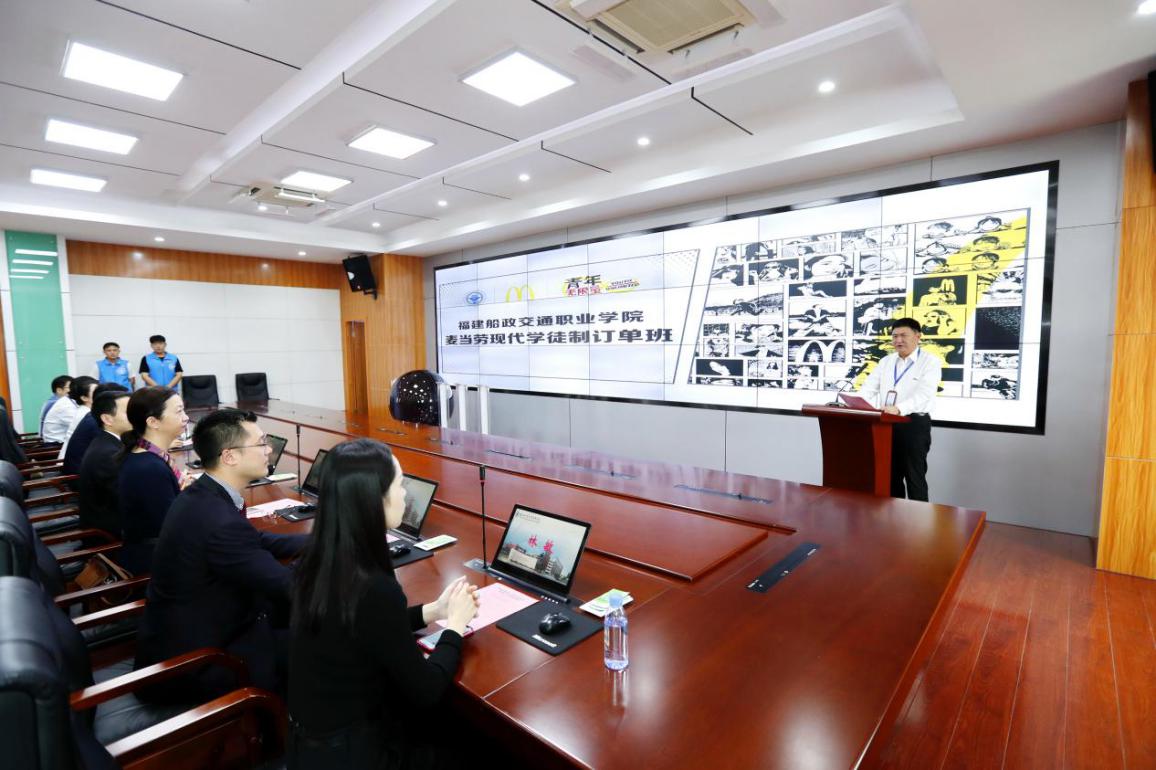 10月21日下午,福建船政交通職業(yè)學(xué)院經(jīng)濟(jì)與管理學(xué)院與福州金拱門食品有限公司“現(xiàn)代學(xué)徒制”人才培養(yǎng)項(xiàng)目簽約授牌儀式在學(xué)院隆重舉行。本次活動(dòng)由經(jīng)濟(jì)與管理學(xué)院副院長(zhǎng)林穎主持,福建船政交通職業(yè)學(xué)院副院長(zhǎng)高汝武,學(xué)生處處長(zhǎng)王心金,團(tuán)委書記陳慧,經(jīng)濟(jì)與管理學(xué)院黨總支書記俞素平,經(jīng)濟(jì)與管理學(xué)院院長(zhǎng)房曰榮,經(jīng)濟(jì)與管理學(xué)院黨總支副書記林麗萍,經(jīng)濟(jì)與管理學(xué)院副院長(zhǎng)吳吉明,經(jīng)濟(jì)與管理學(xué)院各教研室主任,福建麥當(dāng)勞高級(jí)總經(jīng)理嚴(yán)平,營(yíng)運(yùn)總監(jiān)盧雯麗,麥當(dāng)勞領(lǐng)導(dǎo)力學(xué)院院長(zhǎng)方方以及麥當(dāng)勞部分餐廳總經(jīng)理出席了此次活動(dòng)。