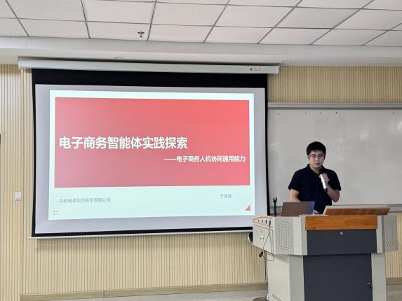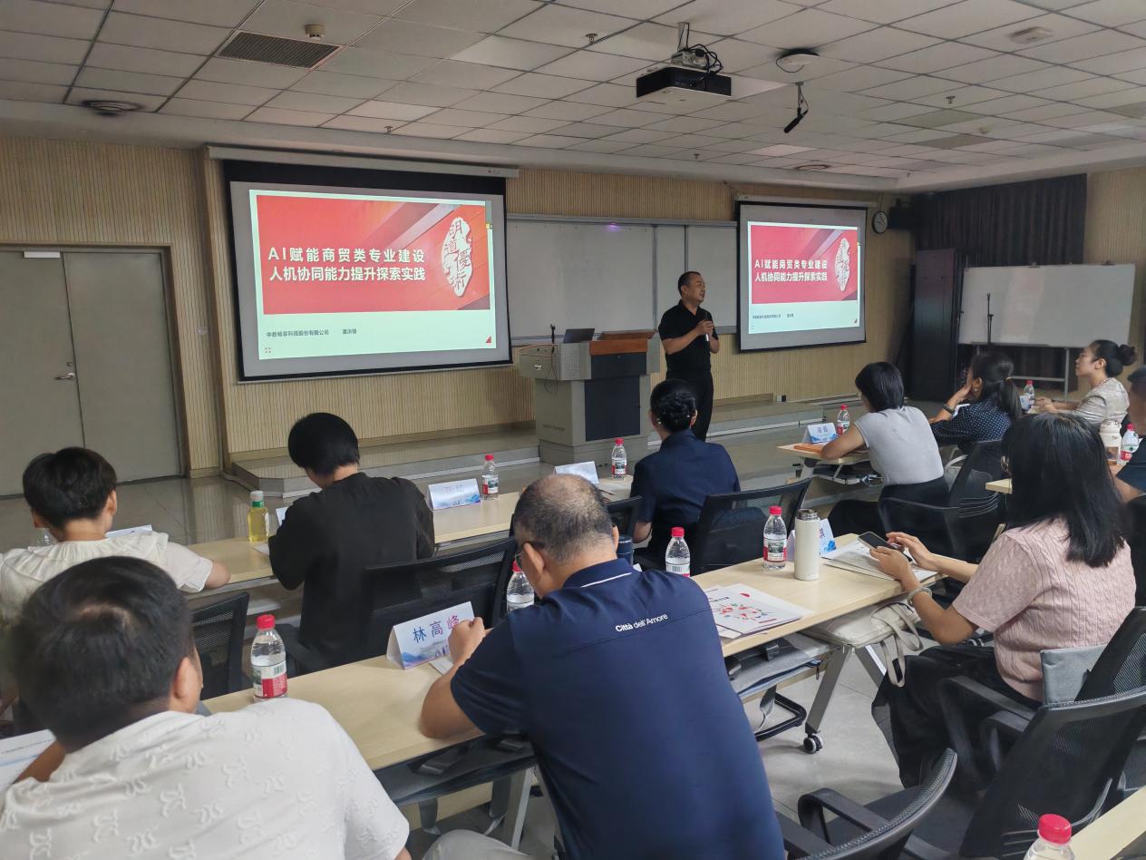 隨后的研討會(huì)上,中教暢享科技股份有限公司副總經(jīng)理潘洪鋒先生作了題為《AI賦能商貿(mào)類專業(yè)建設(shè)—人機(jī)協(xié)同能力提升探索與實(shí)踐》的主旨報(bào)告。潘總從產(chǎn)業(yè)視角出發(fā),深入分析了人工智能在商貿(mào)領(lǐng)域的應(yīng)用趨勢(shì)及其對(duì)崗位能力要求帶來(lái)的變化,系統(tǒng)闡述了如何利用AI技術(shù)賦能專業(yè)內(nèi)涵建設(shè)、課程體系重構(gòu)、教學(xué)資源開(kāi)發(fā)以及學(xué)生人機(jī)協(xié)作能力培養(yǎng),并分享了企業(yè)在相關(guān)領(lǐng)域的探索經(jīng)驗(yàn)與成功實(shí)踐,為院校推進(jìn)教學(xué)改革提供了寶貴的思路借鑒。
