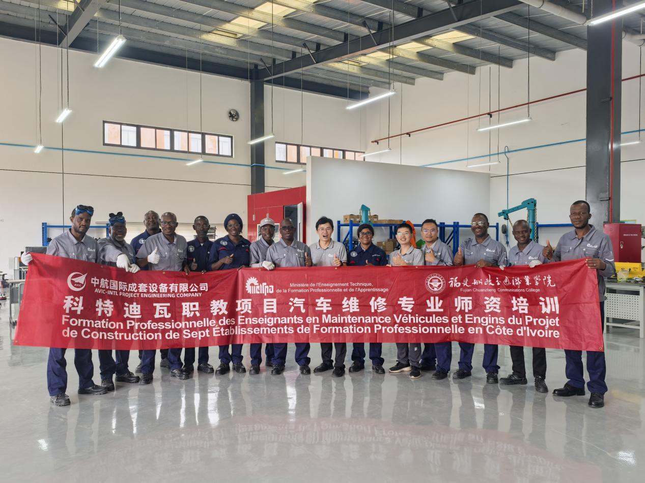 2023年9月至2024年1月,學(xué)院已出色完成中航科創(chuàng)成套公司(以下簡稱“中航成套”)科特迪瓦職教項(xiàng)目汽修專業(yè)在國內(nèi)為期4個(gè)月的師資培訓(xùn)。2025年6至10月,我院教師團(tuán)隊(duì)再次揚(yáng)帆啟航、跨越萬里,遠(yuǎn)赴科特迪瓦首都阿比讓ABOBO校區(qū),輸送“船政模式”職業(yè)教育品牌,圓滿完成了中航成套為期4個(gè)月的科特迪瓦職教項(xiàng)目汽車維修專業(yè)海外師資培訓(xùn)。我院精心選派了梁霖鋒、張光葳和陳星三位既精通汽車前沿技術(shù)又富有教學(xué)經(jīng)驗(yàn)的骨干教師,組成專家團(tuán)隊(duì)“送教上門”,培訓(xùn)面向科特迪瓦當(dāng)?shù)囟嗨殬I(yè)院校的14名教師,團(tuán)隊(duì)克服當(dāng)?shù)貤l件限制,遇山開路、遇水架橋,創(chuàng)造性地采用了“培訓(xùn)+調(diào)研+標(biāo)準(zhǔn)開發(fā)”的融合式方法,確保了培訓(xùn)的高質(zhì)量與實(shí)用性??铺氐贤邍易畲蟮慕逃襟wJDMag刊發(fā)結(jié)業(yè)典禮報(bào)道,對(duì)專家團(tuán)隊(duì)精湛的專業(yè)技能和無私的奉獻(xiàn)精神給予了高度贊譽(yù)。