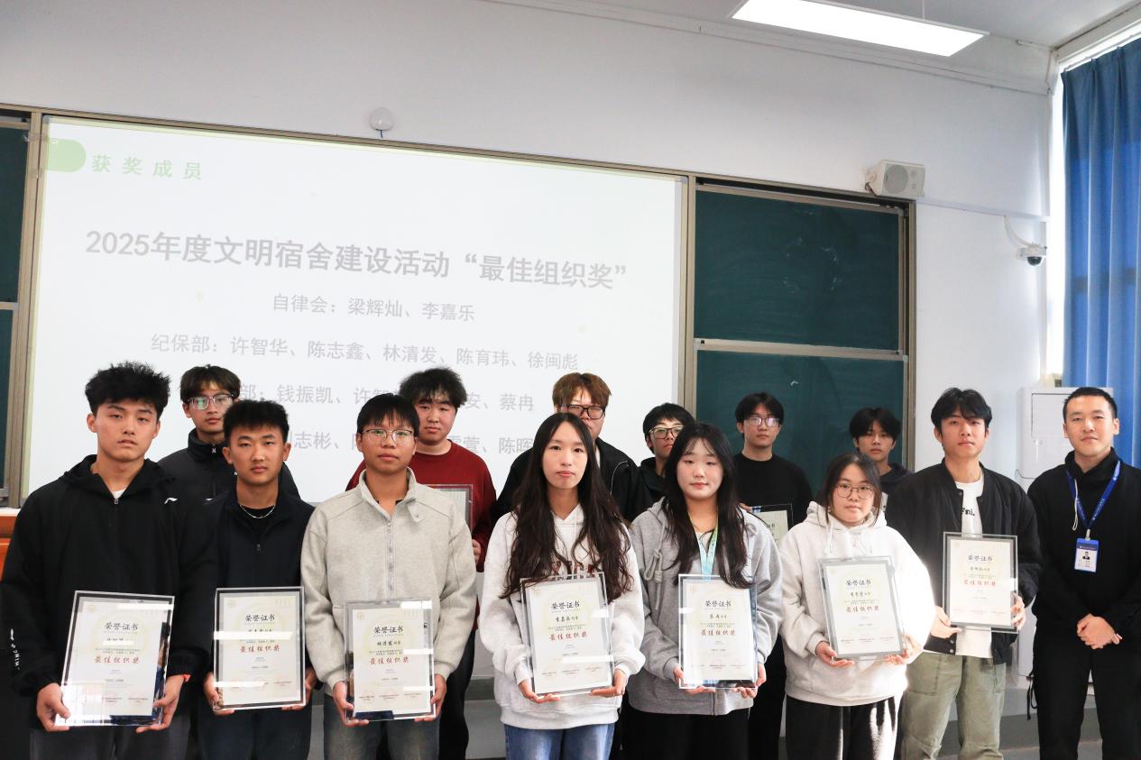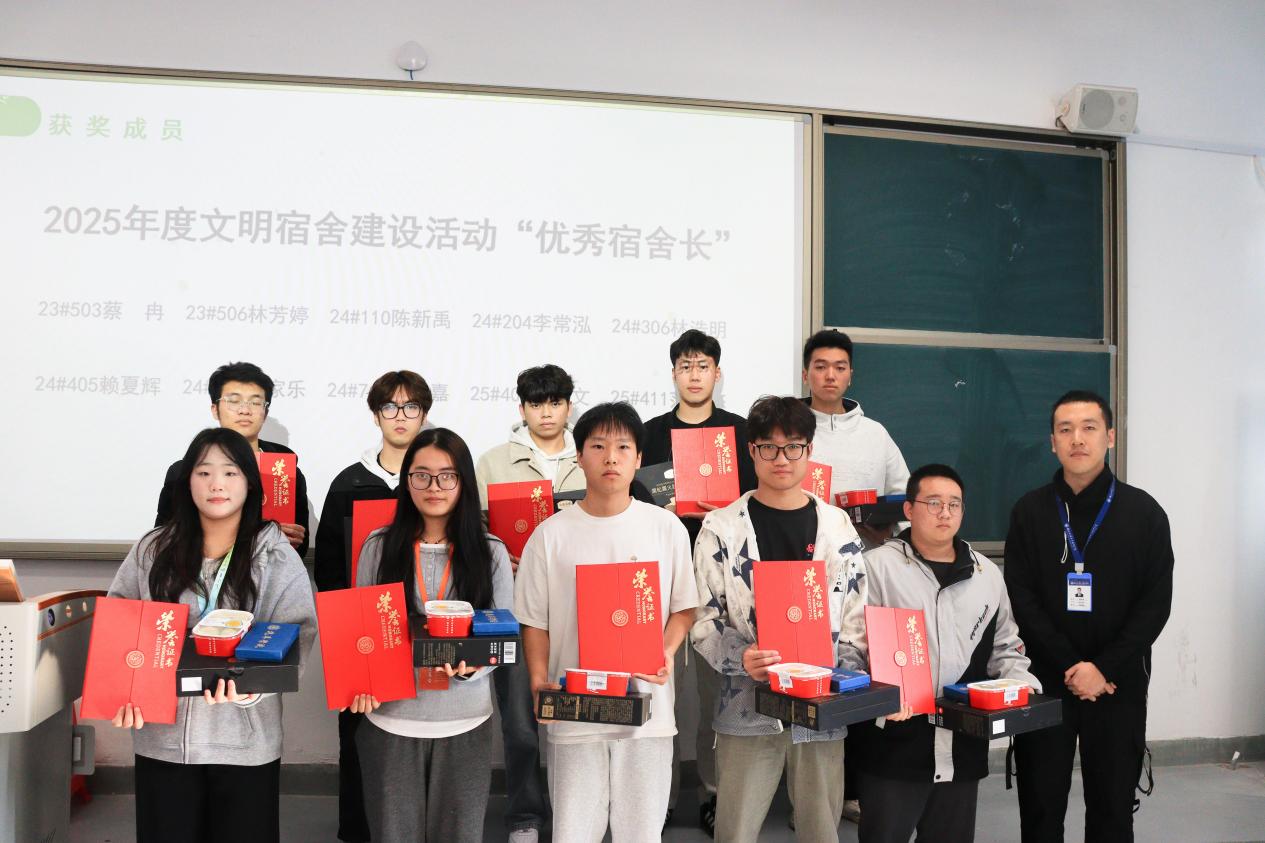 頒獎(jiǎng)環(huán)節(jié)中,輔導(dǎo)員們陸續(xù)上臺(tái)為2025年度文明宿舍建設(shè)先進(jìn)集體與先進(jìn)個(gè)人逐一頒發(fā)榮譽(yù)證書與實(shí)用獎(jiǎng)品,這既是對(duì)過往努力的肯定,更承載著對(duì)學(xué)子們營(yíng)造優(yōu)質(zhì)宿舍生活的期許。值得一提的是,除表彰先進(jìn)集體外,今年活動(dòng)中首次加入了先進(jìn)個(gè)人的表彰環(huán)節(jié),并細(xì)化為“優(yōu)秀宿舍長(zhǎng)”“突出貢獻(xiàn)獎(jiǎng)”“最佳組織獎(jiǎng)”等多個(gè)層級(jí),其中“優(yōu)秀宿舍長(zhǎng)”用于表彰在本年度安全衛(wèi)生檢查中表現(xiàn)優(yōu)異的同學(xué);“突出貢獻(xiàn)獎(jiǎng)”用于表彰在宿舍文化活動(dòng)和維護(hù)宿舍公共區(qū)域環(huán)境中貢獻(xiàn)突出的同學(xué);“最佳組織獎(jiǎng)”用于表彰在文明宿舍建設(shè)評(píng)比活動(dòng)中領(lǐng)導(dǎo)有方、實(shí)施有力的學(xué)生干部,形成梯度獎(jiǎng)勵(lì)機(jī)制,實(shí)現(xiàn)了文明宿舍建設(shè)全過程的有效閉環(huán)。