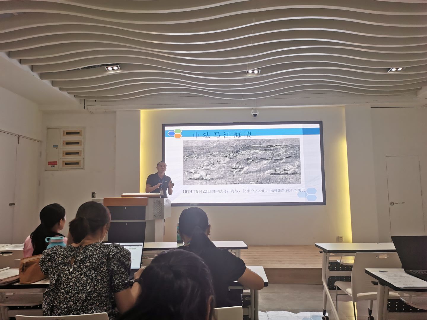 欒靜老師通過設(shè)計環(huán)環(huán)相扣的互動提問,如“你了解的船政之最有哪些?”“船政所鑄艦船有哪些?”“你從甲戌巡臺、馬江海戰(zhàn)、甲午海戰(zhàn)三場大對決中感受到了船政海軍先輩什么精神?”......組織學生積極思考,層層遞進探究進而得出結(jié)論,體現(xiàn)了以學生為主體、以教師為主導(dǎo)的教學理念,得到了老師們的好評。