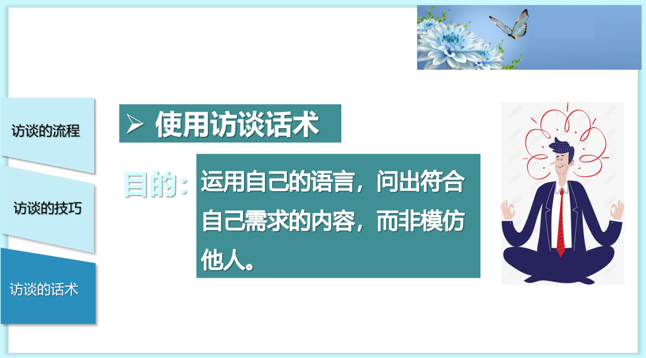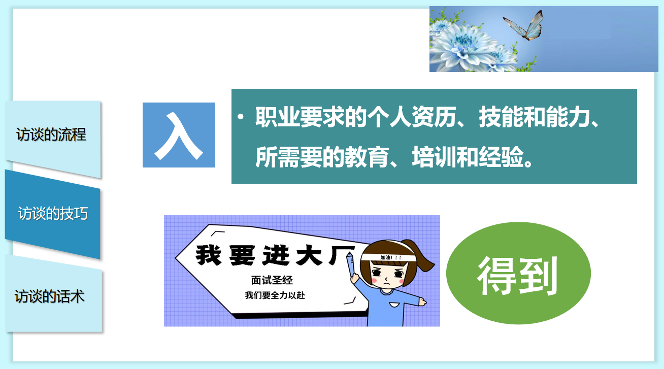 戰(zhàn)偉老師站在企業(yè)的角度,強(qiáng)調(diào)從“行業(yè)+組織+崗位”的角度理解職業(yè),從“入、做、得、拓”四個方面深入開展生涯人物訪談活動,同時結(jié)合實例建議了適合的教學(xué)方法和重難點的突破策略。