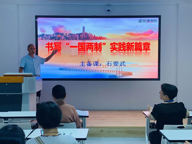本次集體備課的專題是《書寫“一國兩制”實踐新篇章》,石要武老師進(jìn)行了教材分析和學(xué)情分析,強調(diào)了教學(xué)目標(biāo)和教學(xué)重難點,還給出了教學(xué)建議,然后從舉世公認(rèn)的非凡成就、鑒往知來的深刻啟示以及由治及興的光明前景三部分進(jìn)行了詳細(xì)的教學(xué)講解,結(jié)合歷史以及現(xiàn)實,從法理和現(xiàn)狀等多角度說明正是因為采取了“一國兩制”,香港才迎來了輝煌的明天。