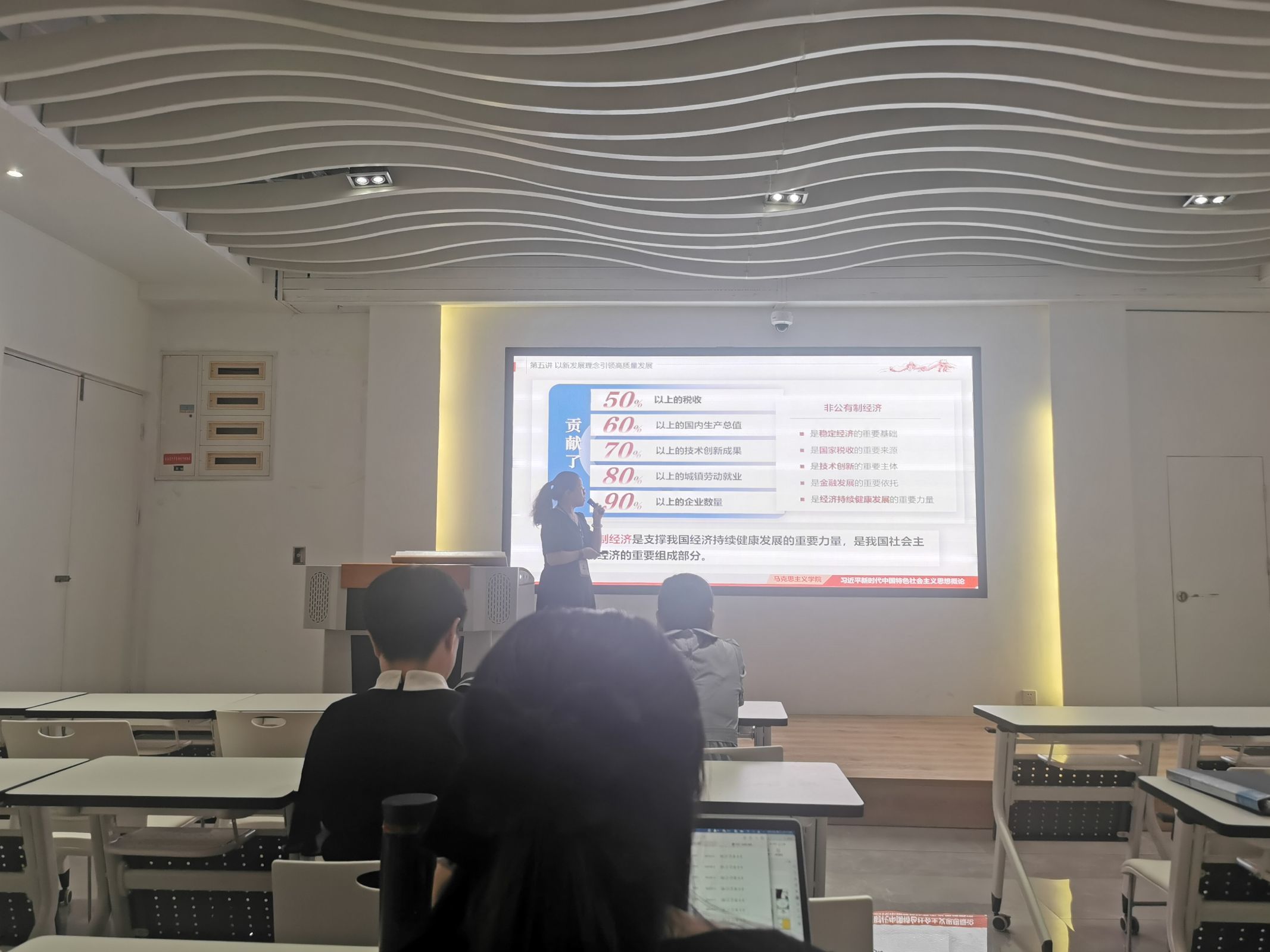 隨后劉麗萍老師就“非公有制經(jīng)濟(jì)在國(guó)民經(jīng)濟(jì)和社會(huì)發(fā)展中的地位和作用”進(jìn)行了教學(xué)片段展示。劉麗萍老師首先引用習(xí)近平總書記在主持召開民營(yíng)企業(yè)座談會(huì)的講話“民營(yíng)企業(yè)和民營(yíng)企業(yè)家是我們自己人”,引發(fā)關(guān)于“民營(yíng)經(jīng)濟(jì)在國(guó)民經(jīng)濟(jì)和社會(huì)發(fā)展中的作用體現(xiàn)在哪里?”的思考。結(jié)合數(shù)字“5、6、7、8、9”引出非公有制經(jīng)濟(jì)的重要貢獻(xiàn)。同時(shí)結(jié)合晉江經(jīng)驗(yàn)的案例,再次明確要毫不動(dòng)搖鼓勵(lì)、支持、引導(dǎo)非公有制經(jīng)濟(jì)發(fā)展。