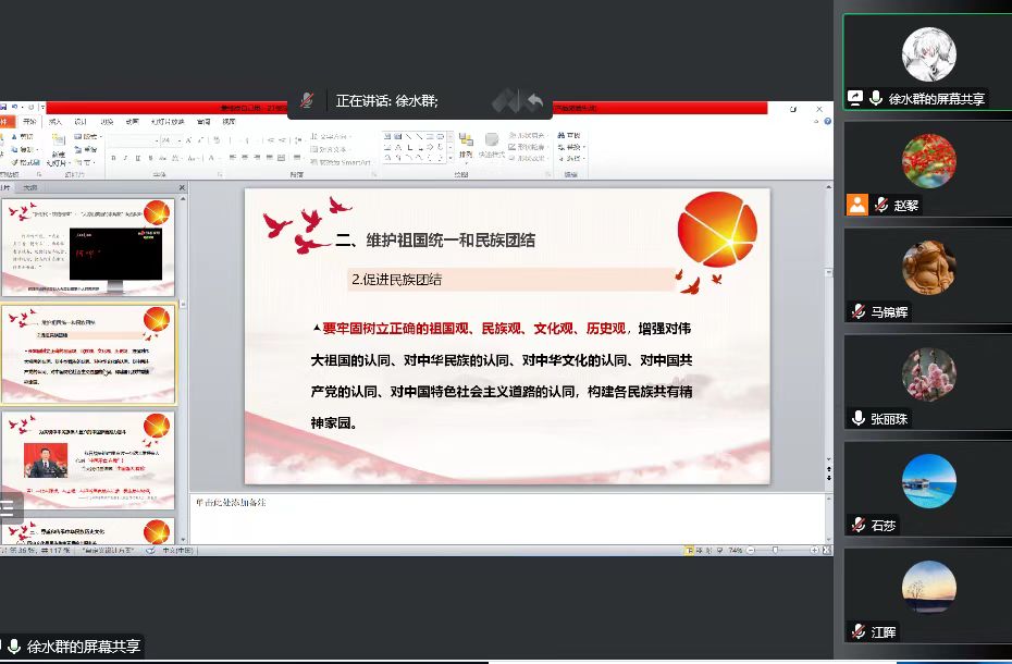 為取得更好的教學(xué)效果,徐水群老師精心準(zhǔn)備,通過上網(wǎng)查找資料、撰寫教案、制作課件,結(jié)合自己的教學(xué)經(jīng)驗(yàn)、結(jié)合時(shí)事政治,對(duì)如何調(diào)動(dòng)學(xué)生積極性,如何處理教材進(jìn)行了仔細(xì)推敲,取得了較好的效果。在第一節(jié)什么是中國精神、為什么要弘揚(yáng)中國精神的基礎(chǔ)上,本次集備主要講述應(yīng)該如何弘揚(yáng)中國精神。徐水群老師通過典型案例、深入剖析講解突出重點(diǎn)、突破難點(diǎn),依據(jù)大中小思政一體化的“大思政”理念,通過回顧中學(xué)內(nèi)容,更加深刻理解大學(xué)理論知識(shí),達(dá)到事半功倍的效果。如講到民族團(tuán)結(jié)時(shí),通過回顧我國民族分布的特點(diǎn);我國處理民族問題的根本原則;我國的民族政策等問題,更加深刻領(lǐng)會(huì)習(xí)近平總書記講的“要鑄牢中華民族共同體意識(shí),促進(jìn)各個(gè)民族像石榴籽一樣緊緊抱在一起”。