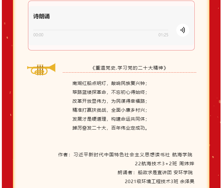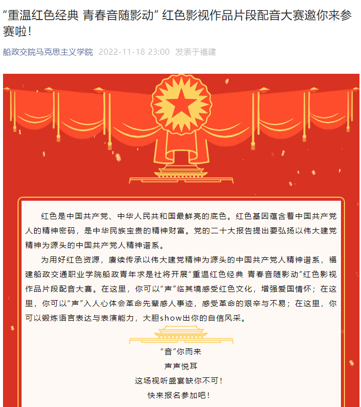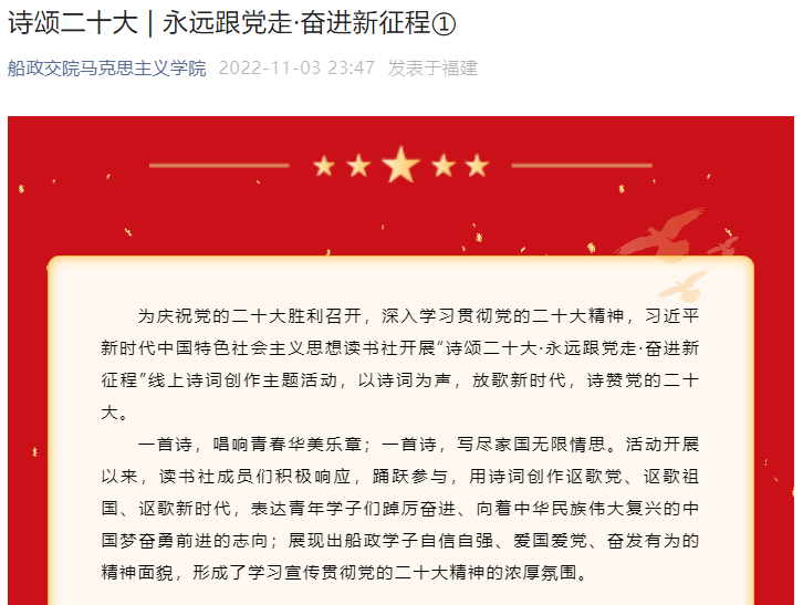 為進(jìn)一步落實(shí)好黨的二十大精神進(jìn)頭腦,馬克思主義學(xué)院用好第一課堂和第二課堂,以形式豐富的活動(dòng)方式激發(fā)青年大學(xué)生的學(xué)習(xí)熱情。習(xí)近平新時(shí)代中國(guó)特色社會(huì)主義思想教研室在全校開(kāi)展“黨的二十大知識(shí)競(jìng)賽”,組織學(xué)生制作學(xué)習(xí)筆記、金句書(shū)法等作品;指導(dǎo)讀書(shū)社學(xué)生開(kāi)展“詩(shī)頌黨的二十大·永遠(yuǎn)跟黨走·奮進(jìn)新征程”線上詩(shī)詞創(chuàng)作主題活動(dòng),以詩(shī)詞為聲,放歌新時(shí)代,詩(shī)贊黨的二十大;船政青年求是社開(kāi)展“重溫紅色經(jīng)典,青春音隨影動(dòng)”主題紅色影視作品片段配音大賽,弘揚(yáng)偉大建黨精神;集體備課,成立黨的二十大精神師生宣講報(bào)告團(tuán)。通過(guò)這一系列舉措力求對(duì)黨的二十大精神學(xué)深學(xué)透、融會(huì)貫通,最終把學(xué)習(xí)、實(shí)踐成果轉(zhuǎn)化為推進(jìn)學(xué)校高質(zhì)量發(fā)展的不竭動(dòng)力。