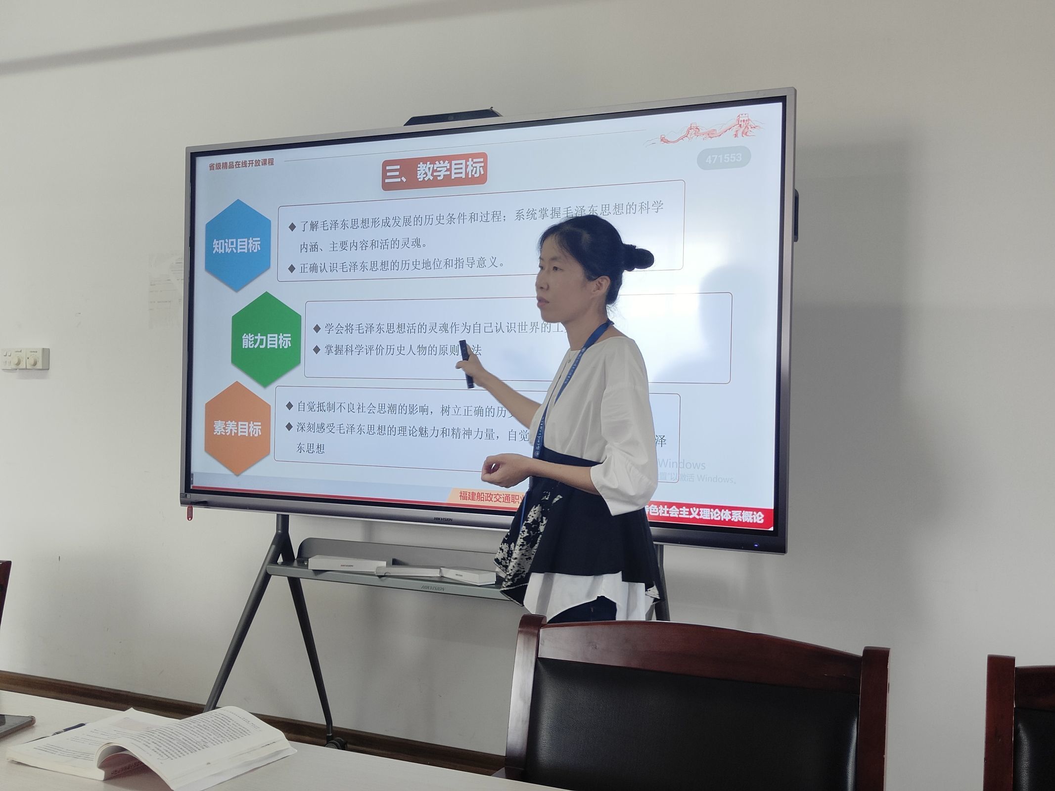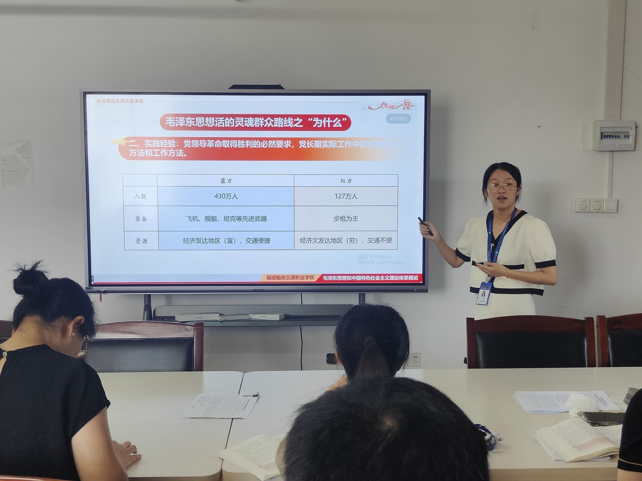 接著,范碧華老師和鄭黎瓊老師分別以“革命軍隊(duì)建設(shè)和軍事戰(zhàn)略的理論”和“毛澤東思想活的靈魂——群眾路線之為什么”進(jìn)行片段教學(xué)展示。兩位老師的講授語(yǔ)言流暢、導(dǎo)入新穎、案例鮮活、條理清晰、重點(diǎn)突出,取得了良好的示范效果。