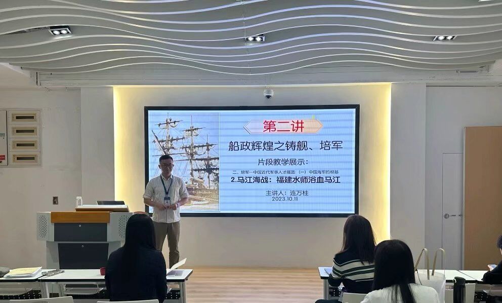 江冰老師通過對教材、學(xué)情、教學(xué)目標(biāo)、重點(diǎn)和難點(diǎn)做詳細(xì)介紹,圍繞船政在鑄艦、培軍取得輝煌方面進(jìn)而說明“一部船政史,半部中國近代史”意義,在授課模塊方面從專題設(shè)計、課程框架、教學(xué)素材選用、教學(xué)案例導(dǎo)入、教學(xué)方法等進(jìn)行教學(xué)設(shè)計。鑒于本課程教學(xué)特點(diǎn),在整體教學(xué)上,江冰老師建議要老師們在授課中要注重重要史料講解的同時,注重挖掘史料背后的思政元素,與重要時政大事結(jié)合,達(dá)到課程思政目標(biāo)。接著,袁穎婷、連萬桂、余夢莉老師分別以“鑄艦三級跳”和“馬江海戰(zhàn)”“中國空軍的發(fā)源地”為主題進(jìn)行片段教學(xué)展示。她們以貼合實(shí)際、貼近學(xué)生生活的案例,生動展示了相關(guān)知識點(diǎn),邏輯清晰、突出重點(diǎn),取得了良好的示范效果。