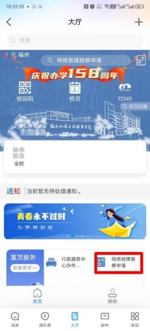 通過置頂服務(wù)或者搜索網(wǎng)絡(luò)找到網(wǎng)絡(luò)故障報(bào)修按鈕點(diǎn)擊