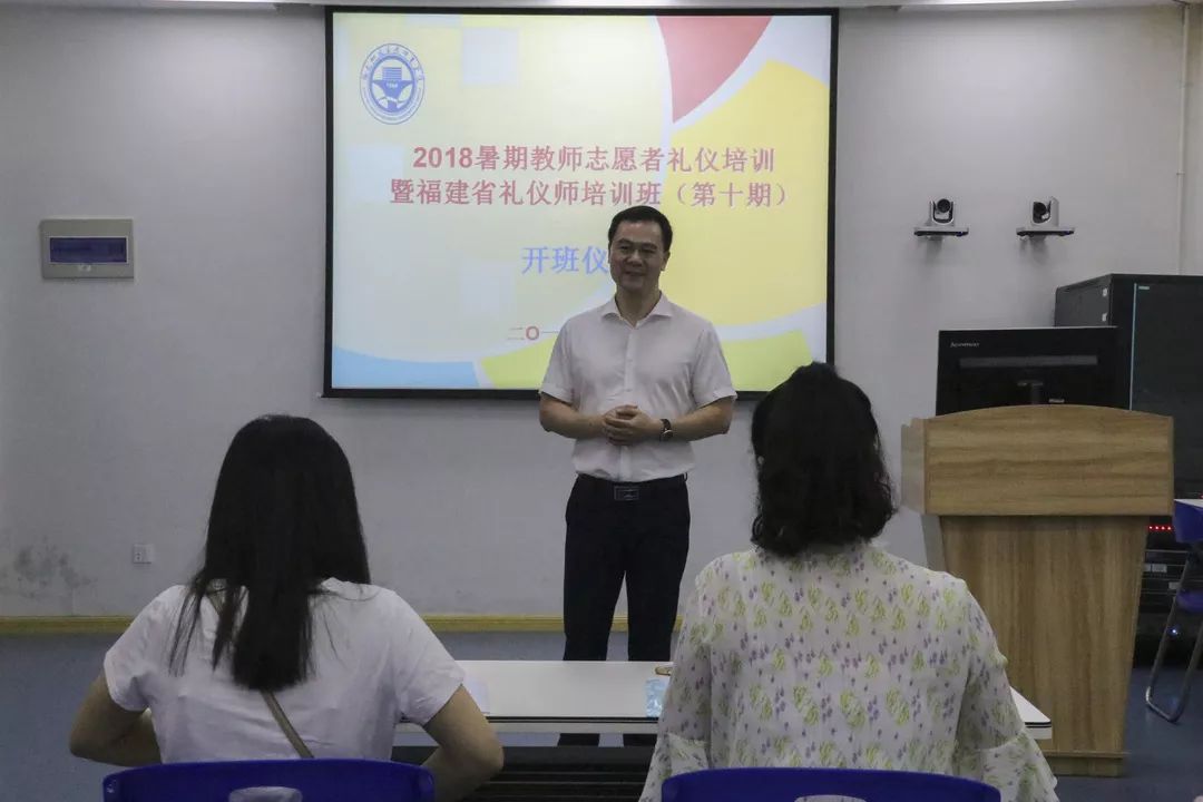 7月16日上午,培訓(xùn)班開(kāi)班儀式在我校南區(qū)形體塑造中心舉行。福建禮儀協(xié)會(huì)會(huì)長(zhǎng)蔡妮娜、福建禮儀協(xié)會(huì)秘書(shū)長(zhǎng)黃利天、福建省禮儀協(xié)會(huì)常務(wù)理事紀(jì)智媛副教授、校團(tuán)委陳慧副書(shū)記及參加培訓(xùn)的教師志愿者出席了本次開(kāi)班儀式。