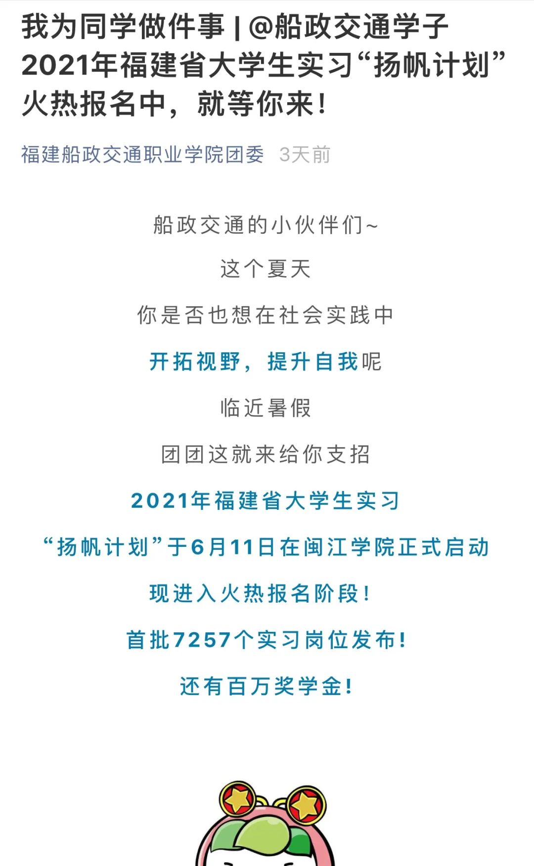 2021年福建省大學生實習“揚帆計劃”已正式啟動,首批7257個實習崗位發(fā)布,現已進入火熱報名階段,為切實幫助船政交通學子認識、了解、參與“揚帆計劃”,準確定位自己喜歡的實習崗位,在社會實踐中開拓視野,提升自我,校學生會及時推送和轉發(fā)大學生實習“揚帆計劃”相關報道,傳遞最新最快崗位信息。