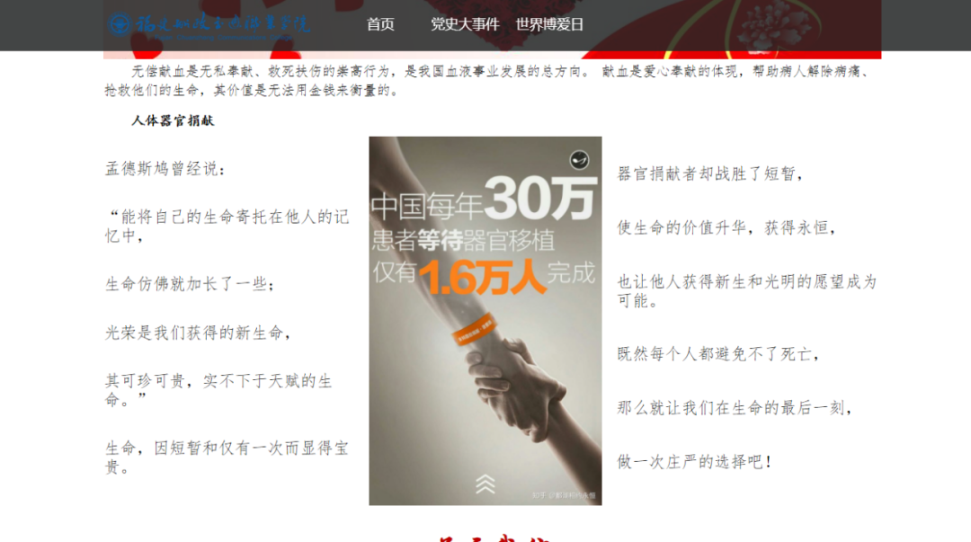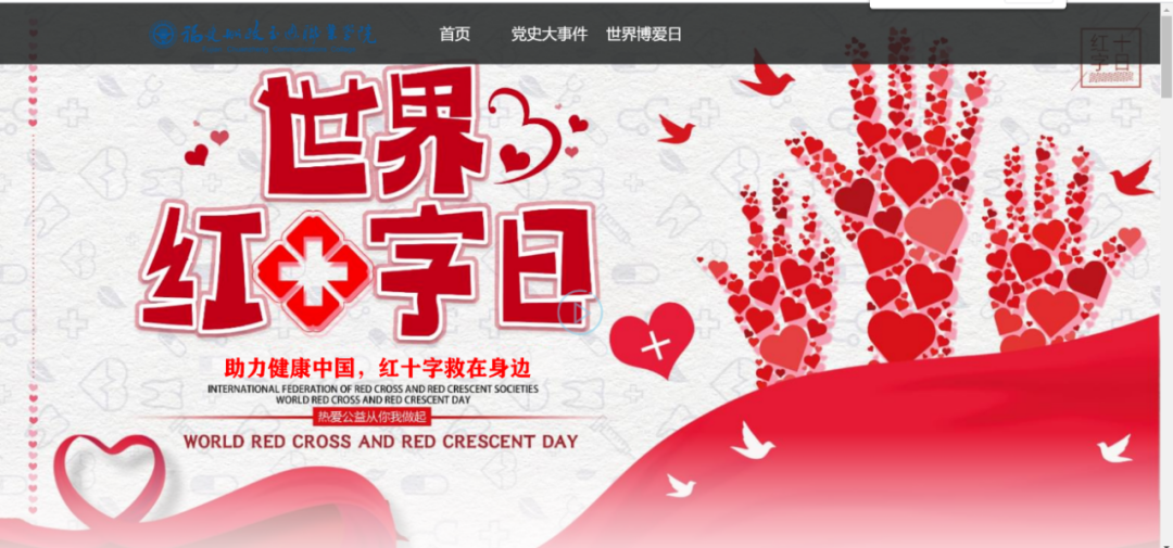 通過對黨史的學(xué)習(xí),我們更好的了解過去,以革命先輩的崇高精神為追求,我校紅十字會學(xué)生分會于5月1日-10日開展“學(xué)史崇德,博愛載物”網(wǎng)頁設(shè)計比賽,本次活動共收到船政學(xué)子投稿作品40份。有力推動學(xué)習(xí)黨史氛圍,在踐行社會主義核心價值觀中,弘揚“人道、博愛、奉獻”的紅十字精神。