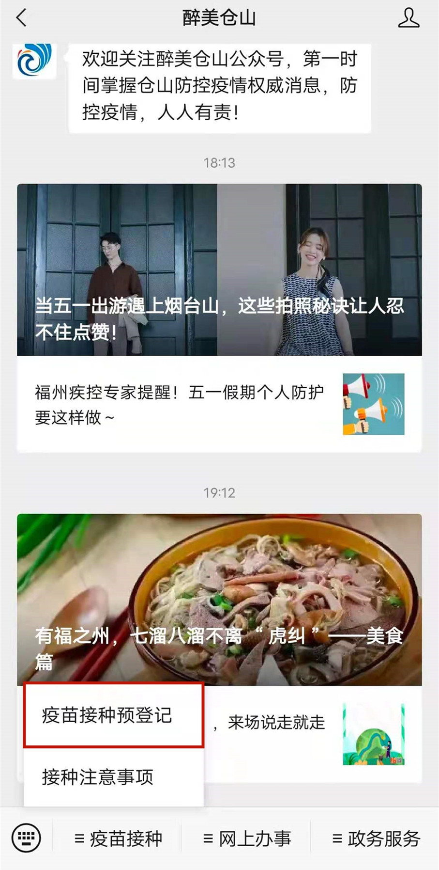 關(guān)注并進入“醉美倉山”公眾號后,點擊下方“疫苗接種”按鈕,再點擊“疫苗接種預登記”。