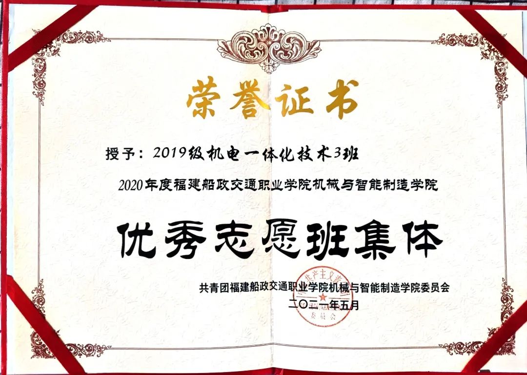 2020、2021連續(xù)兩年被共青團(tuán)福建船政交通職業(yè)學(xué)院委員會(huì)及共青團(tuán)福建船政交通職業(yè)學(xué)院機(jī)械工程系總支委員會(huì)評(píng)為五四紅旗團(tuán)支部;2020年12月被福建船政交通職業(yè)學(xué)院評(píng)為文明班級(jí);2021年5月被共青團(tuán)福建船政交通職業(yè)學(xué)院機(jī)械與智能制造學(xué)院委員會(huì)評(píng)為優(yōu)秀志愿班集體。