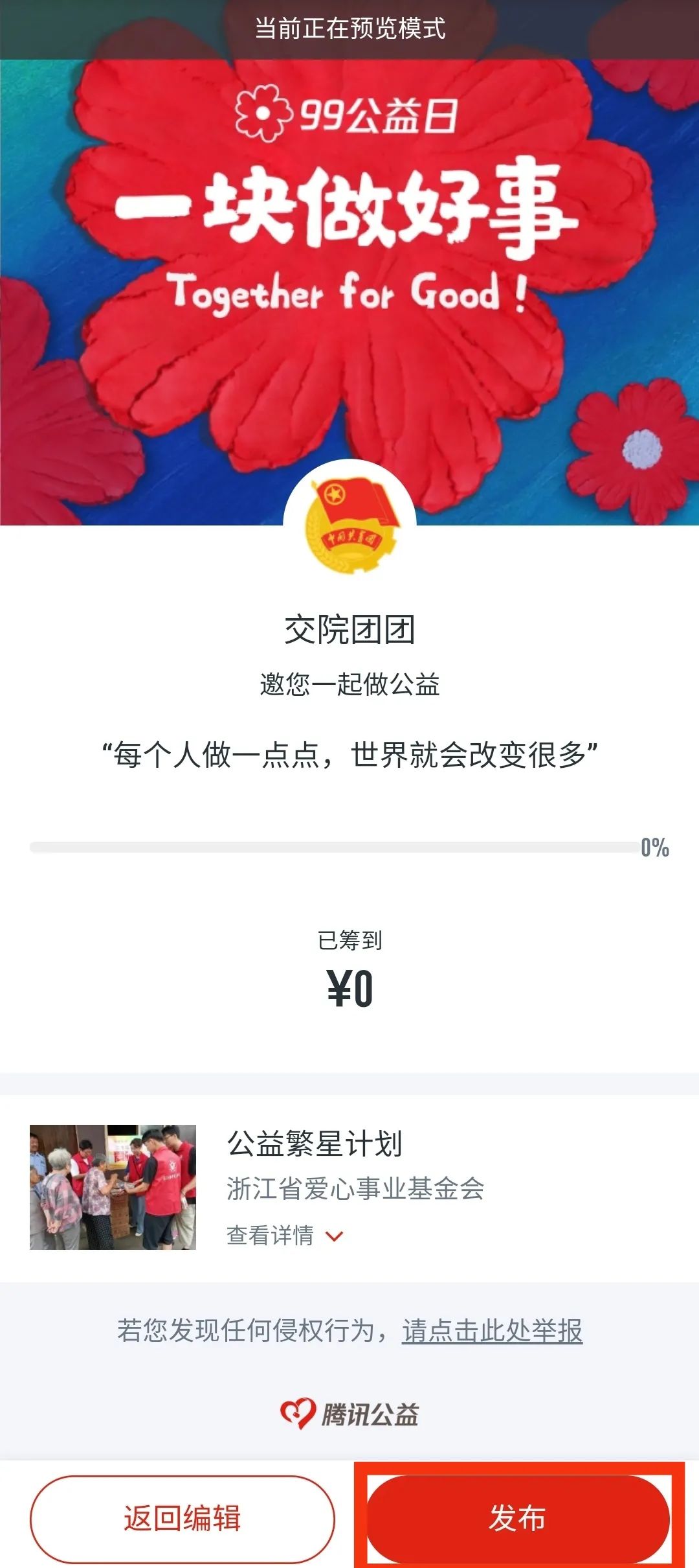 第二步,填寫發(fā)起人、發(fā)起說明等信息,勾選《騰訊公益一起捐用戶協(xié)議》后,進(jìn)入預(yù)覽界面。