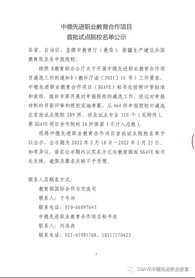 近日,中德先進職業(yè)教育合作項目首批試點院校公示名單公布,我院成功入選首批試點院校,機械制造及自動化入選智能制造領(lǐng)域試點專業(yè),計算機應(yīng)用技術(shù)入選新一代信息技術(shù)領(lǐng)域試點專業(yè)!